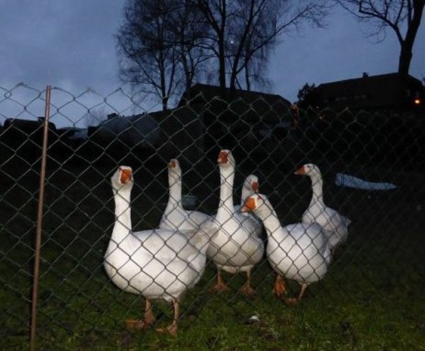 Ab wann ist Mord Massenmord? Einer der Massenmörder meines Dorfes hat – wie jedes Jahr – eiskalt wieder zugeschlagen. Die 6 weißen Gänse sind inzwischen durch den Gewohnheitsmörder abgemurkst worden. Diesmal konnte ich zumindest ein Foto vom Ort des Szenario machen. Die Mordopfer dieses Menschen sehen wir hier enthauptet aufgereiht und aufgehängt. Wie ein Corpus Delicti. – Diese IS-Idioten – von denen wir in den Medien so viel Schreckliches erfahren – können so etwas nicht besser machen. Aber diese Massenmörder toben ihre blutrünstigen Neigungen ja vornehmlich an unliebsamen Menschen aus. Aber beide Typen von Mördern gehören für ihr menschliches Versagen gleichermaßen bestraft.